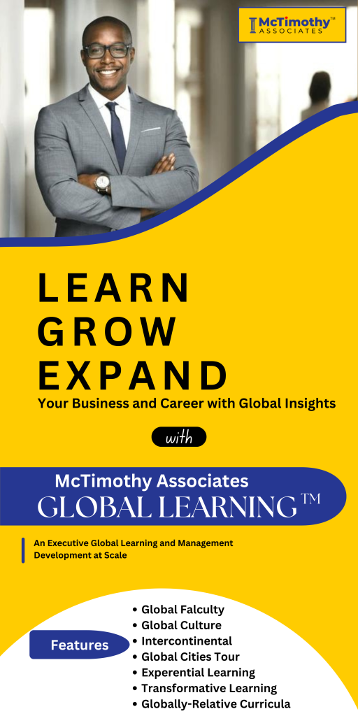 The McTimothy Global Learning™ involves a critical analysis of and engagement with complex, interdependent global systems and legacies (such as natural, economic, physical, social, cultural, technological, and political) and their implications for people’s lives and the earth’s sustainability. Through McTimothy Global Learning™, which is aimed at adult learners in our context case via Executive Education on a global scale, our executive learners should: